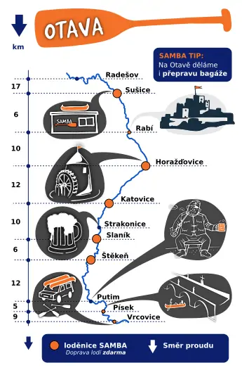 - K výpůjčce od nás dostanete mapku Otavy s vyznačenými loděnice, kempy a jezy. Pokud byste si chtěli znalost Otavy osvěžit před vyplutím, tady si můžete mapku stáhnout. Kdo je vyznavačem klasičtější kilometráže, může si ji stáhnout tady.