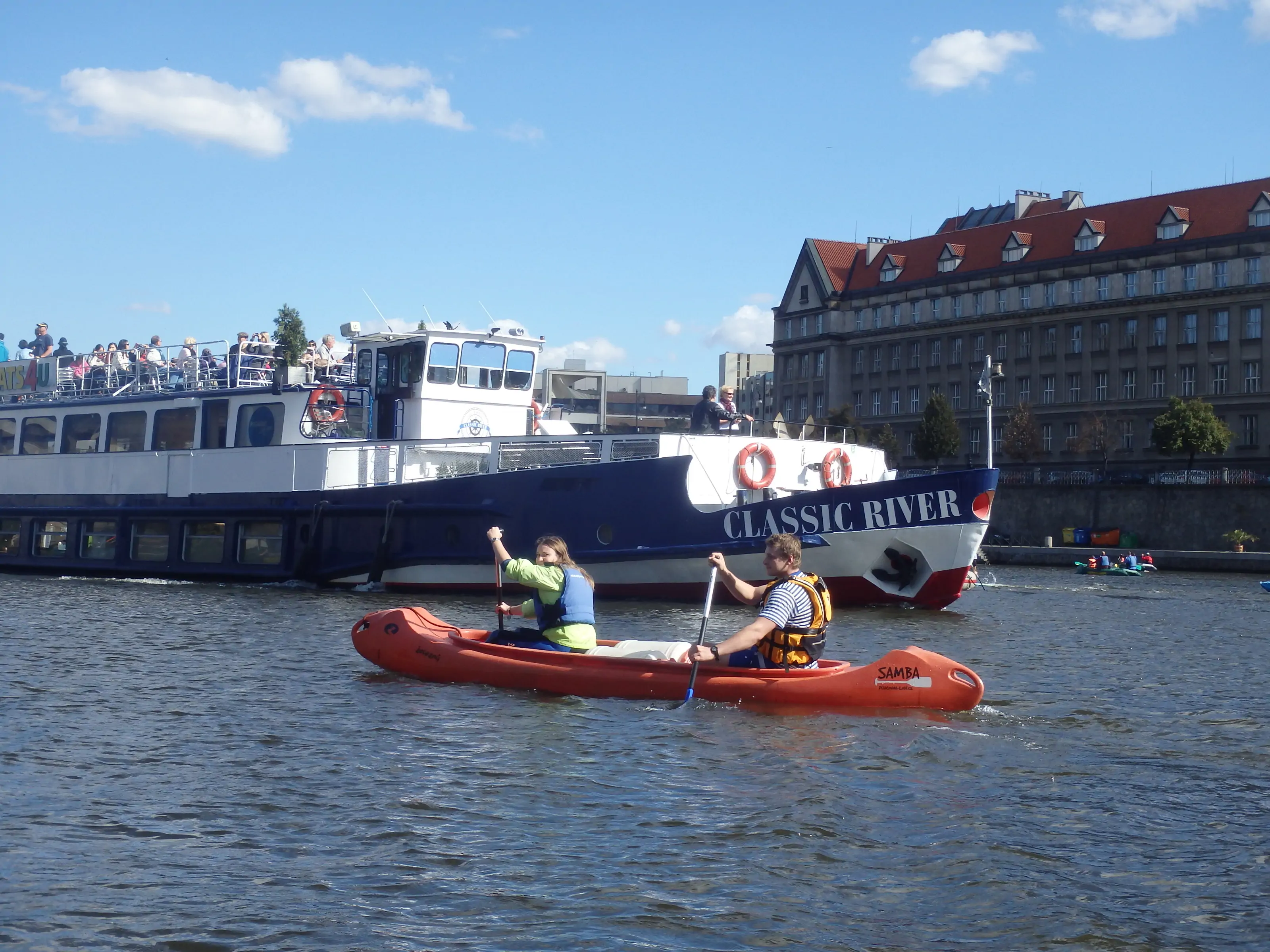 Závod Napříč Prahou – Přes 3 jezy je tradičním pražským vodáckým závodem s historií sahající až do roku 1939. Trať závodu je dlouhá asi 6,5 říčních kilometrů se startem na Císařské louce a s cílem na ostrově Štvanice. Pro ty, co zrovna netouží závodit na pramici je připraveno volné splutí. Plavba kolem Vyšehradu, Národního divadla, pod Karlovým mostem a zakončená na Štvanici určitě stojí za to. Přes Prahu můžete plout na kanoi, kajaku, nafukovací kanoi nebo raftu. Naše kanoe Samba se na záludných pražských jezech určitě osvědčí.