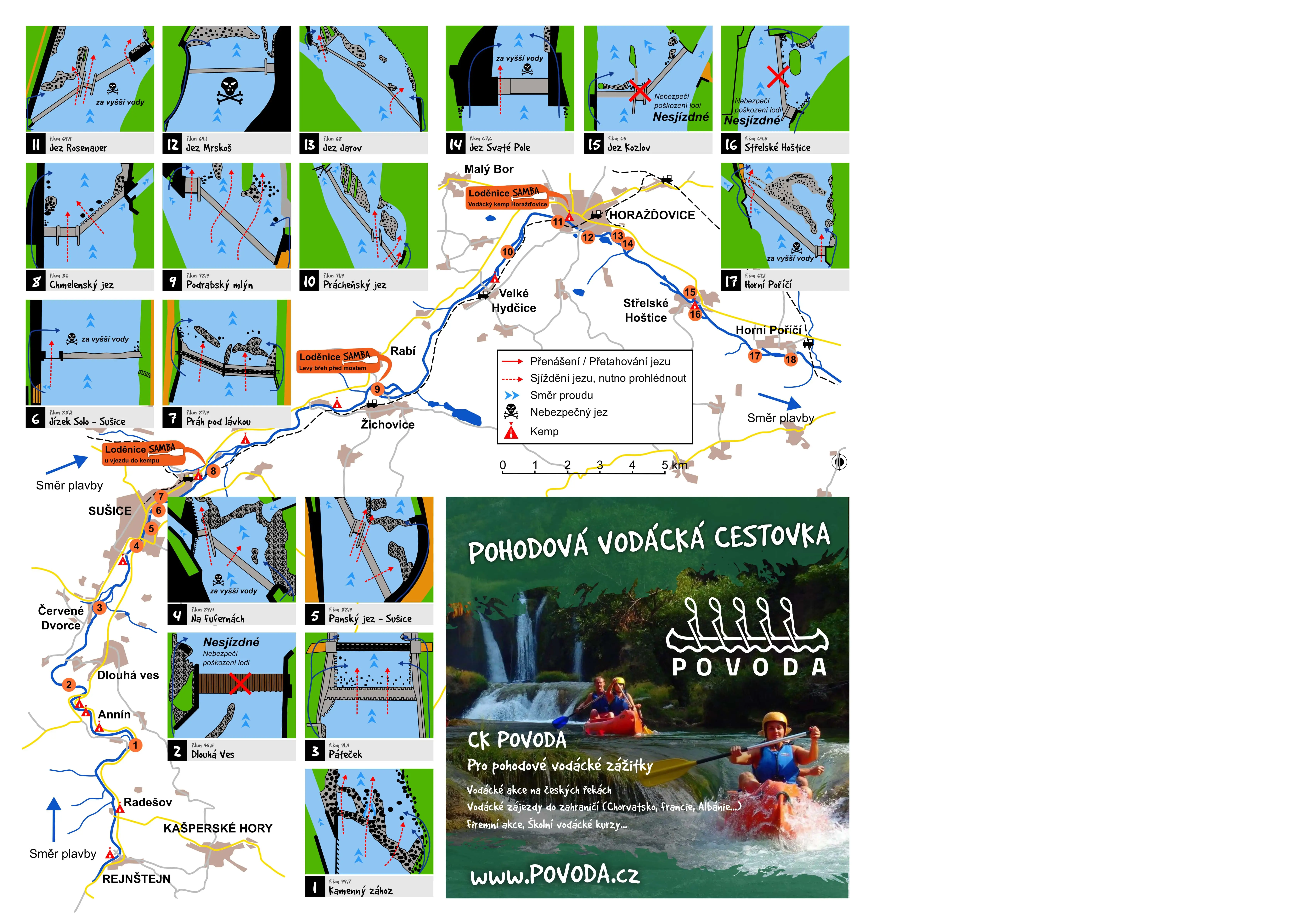 Na mapě jsou schémata jezů a jejich možnosti splutí. Doporučujeme však před každým jezem či překážkou zastavit a situaci si na vlastní oči prohlédnout. Jezy se mění v závislosti na výšce hladiny vody. Po velké vodě může být v jezu třeba zaseknutá větev apod.